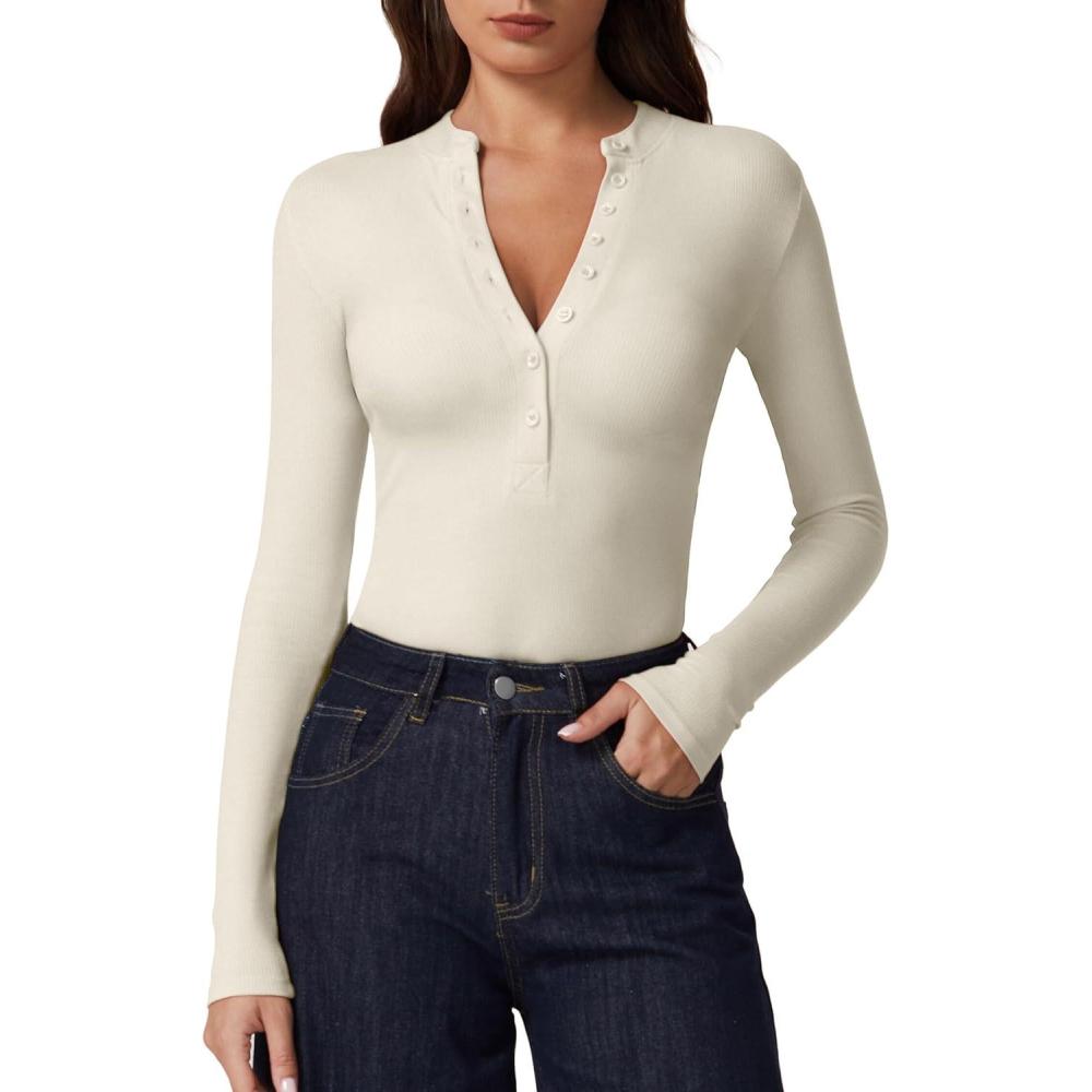 QINSEN Button Down Shirts for Women V Neck Long Sleeve Ribbed Knit Slim Fit Basic Tee Tops(Beige)