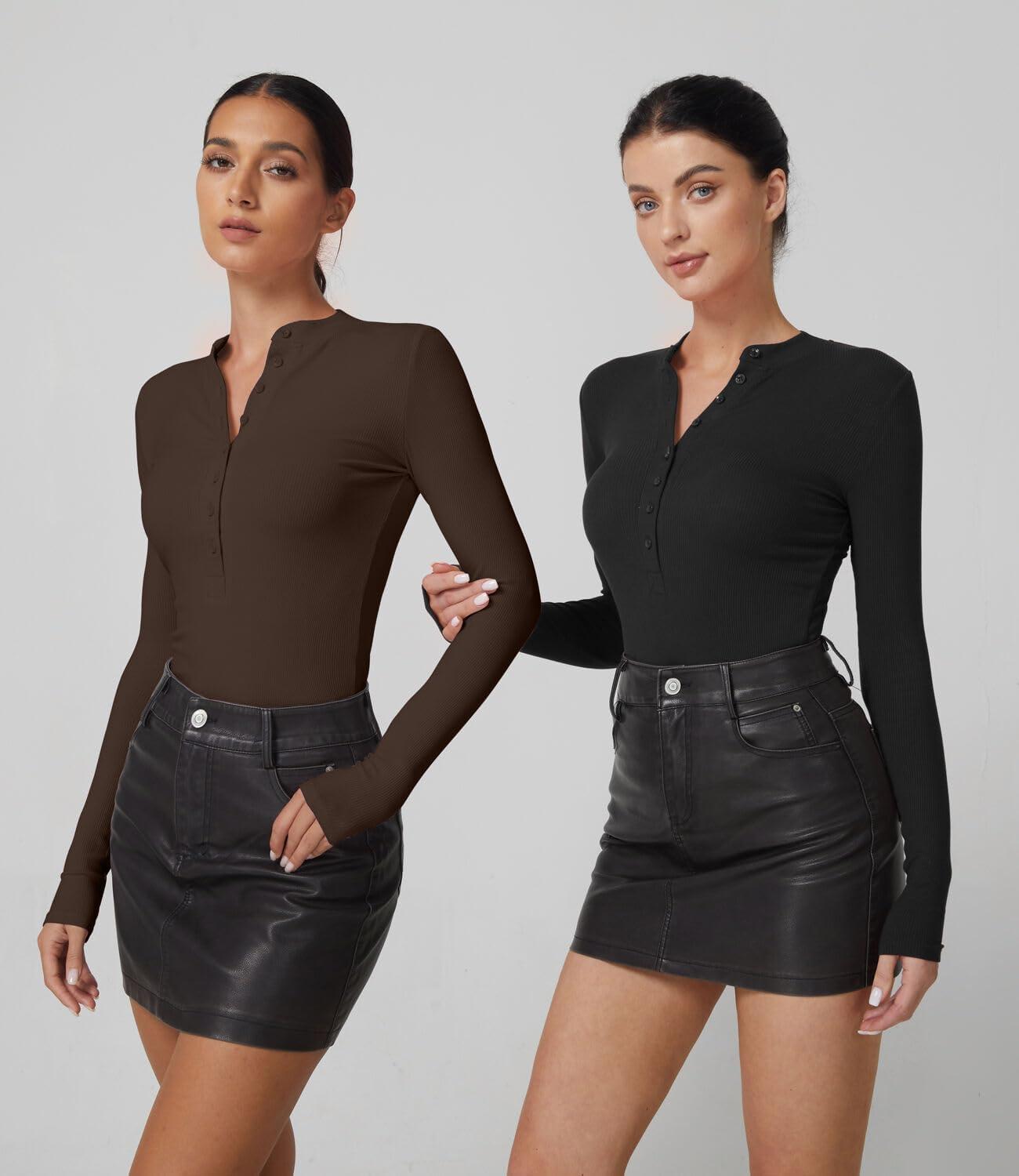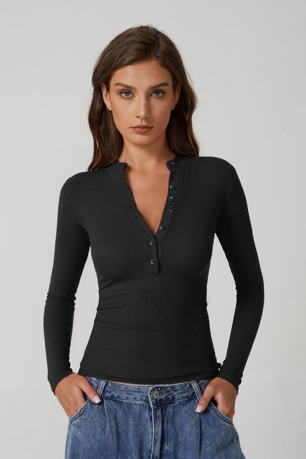 QINSEN Button Down Shirts for Women V Neck Long Sleeve Ribbed Knit Slim Fit Basic Tee Tops(Black)