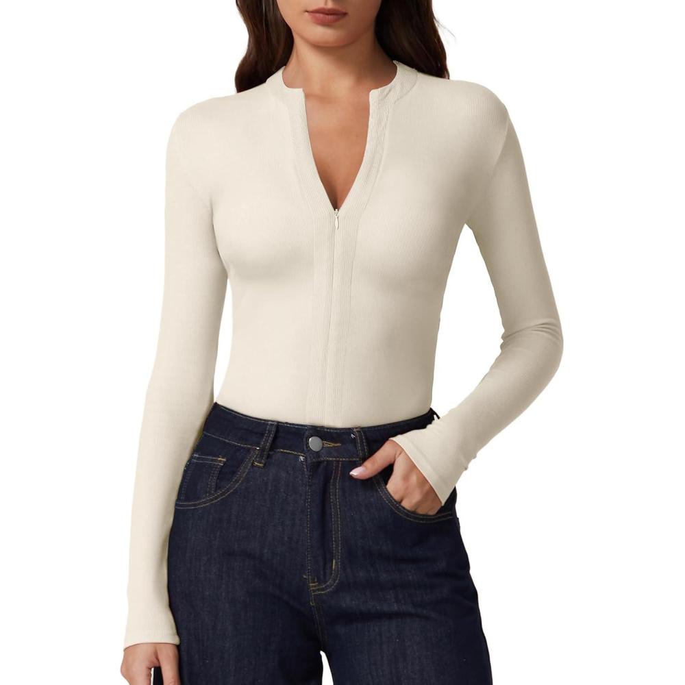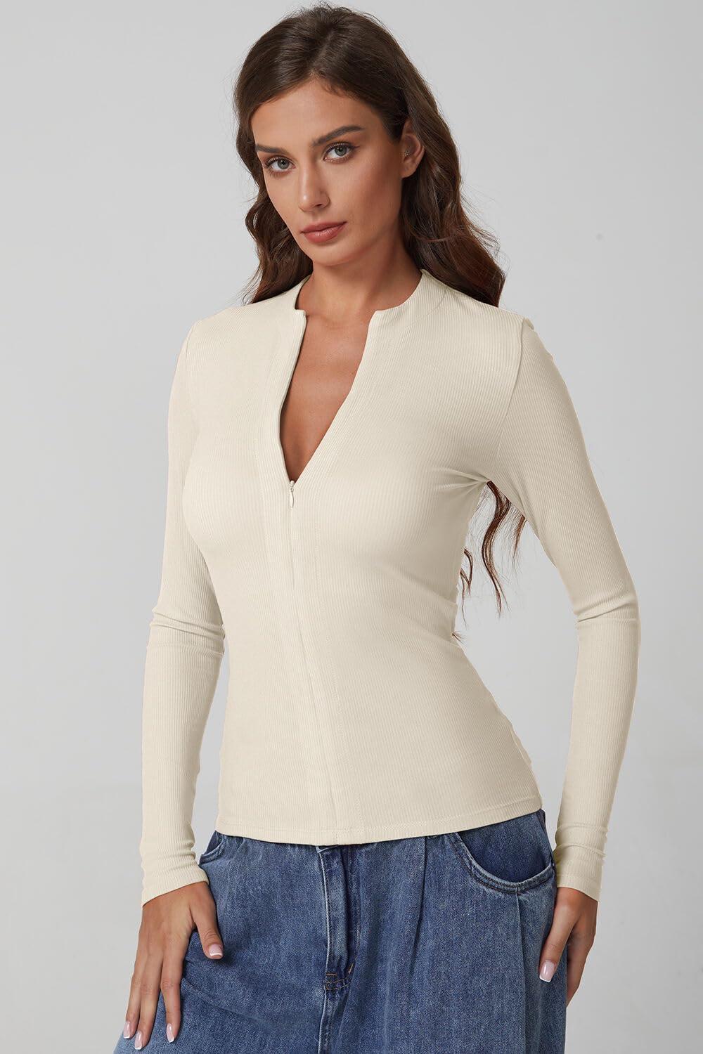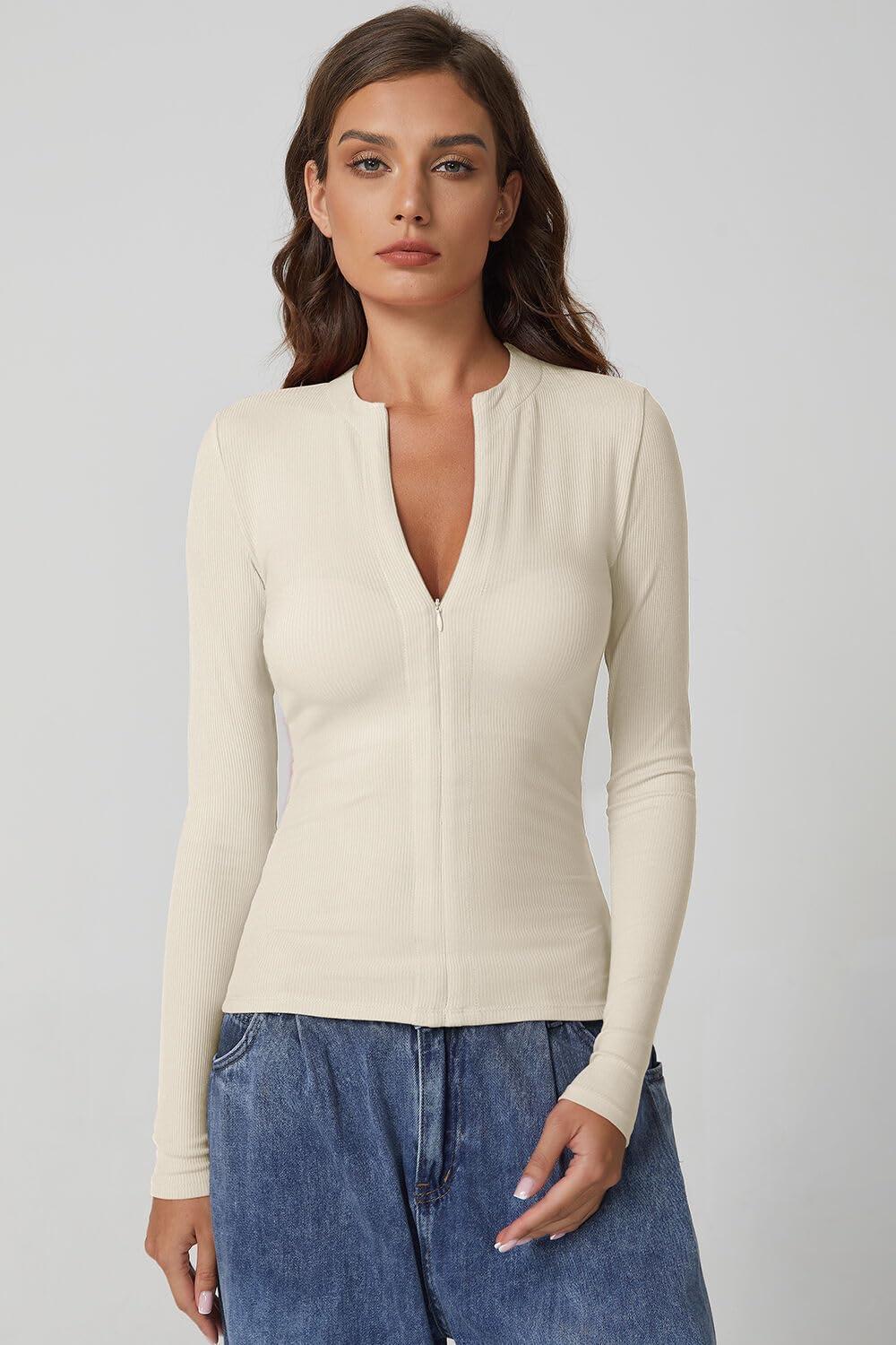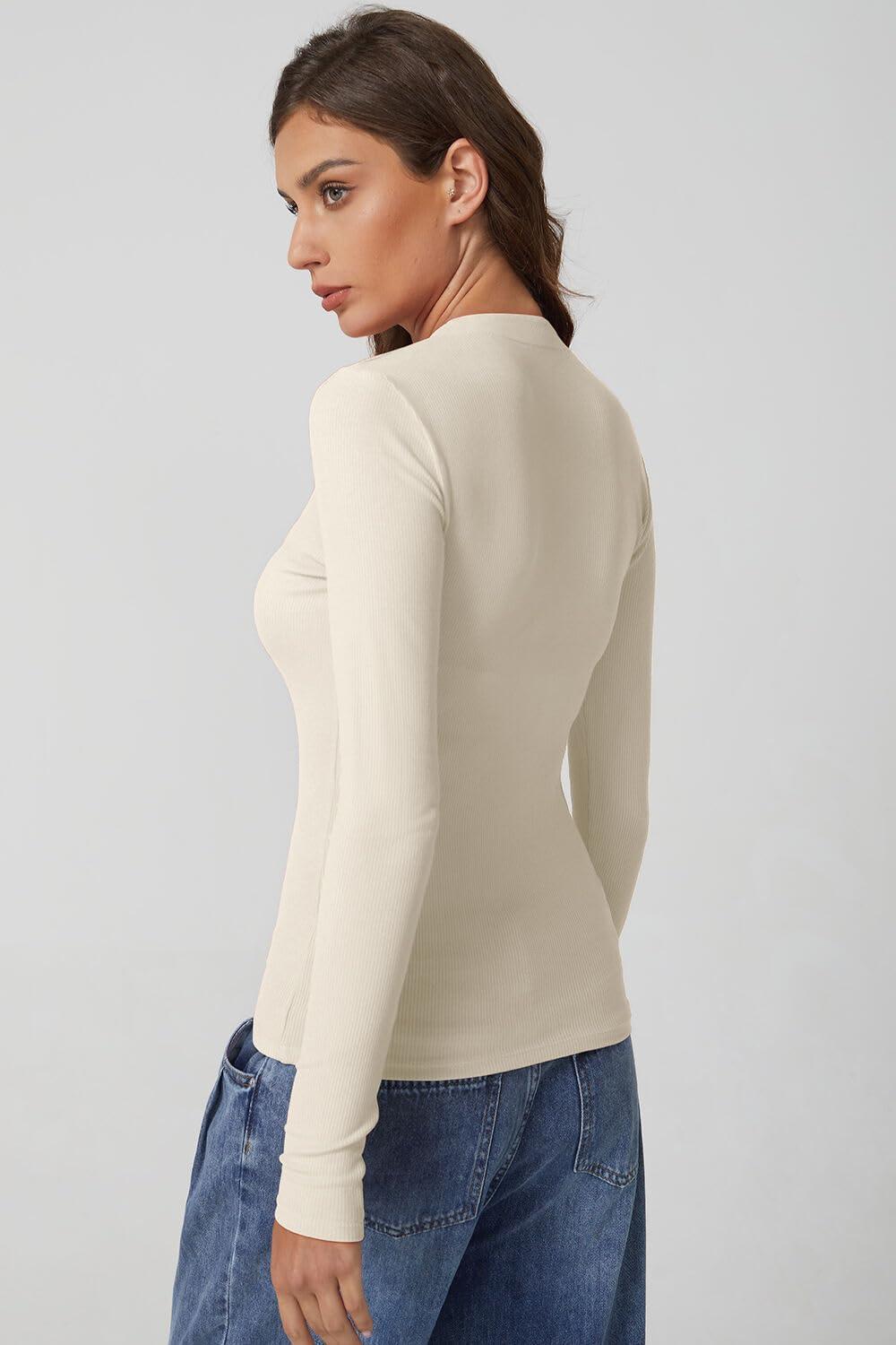QINSEN Long Sleeve Shirts for Women Crewneck Half Zipper Ribbed Knit Going Out Tops Full Length Basic Tee(Beige)