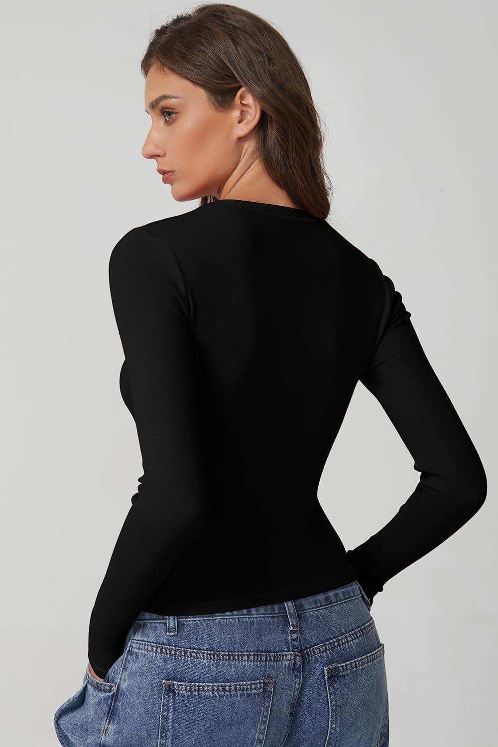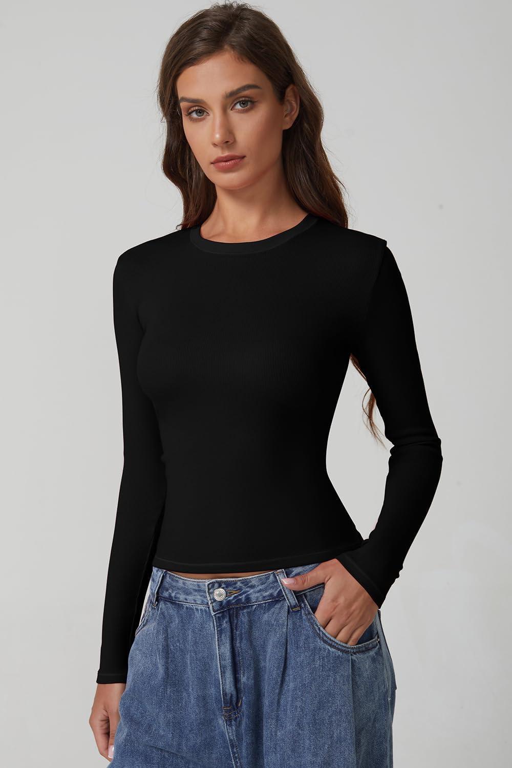QINSEN Long Sleeve Shirts for Women Crewneck Rib Knit Slim Fit Going Out Tops Casual Basic Tee(Black)