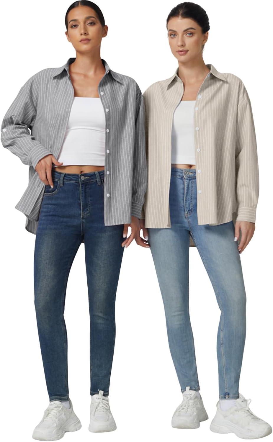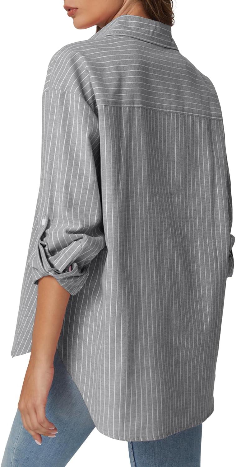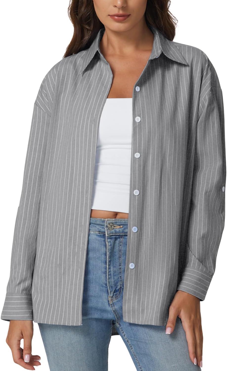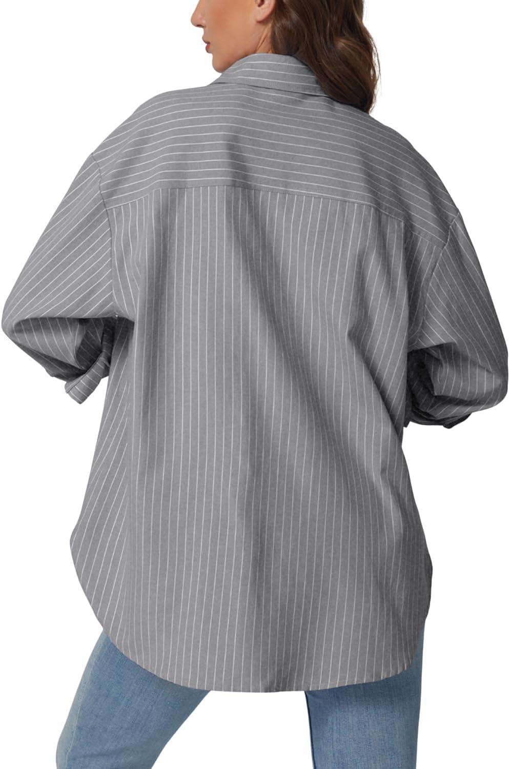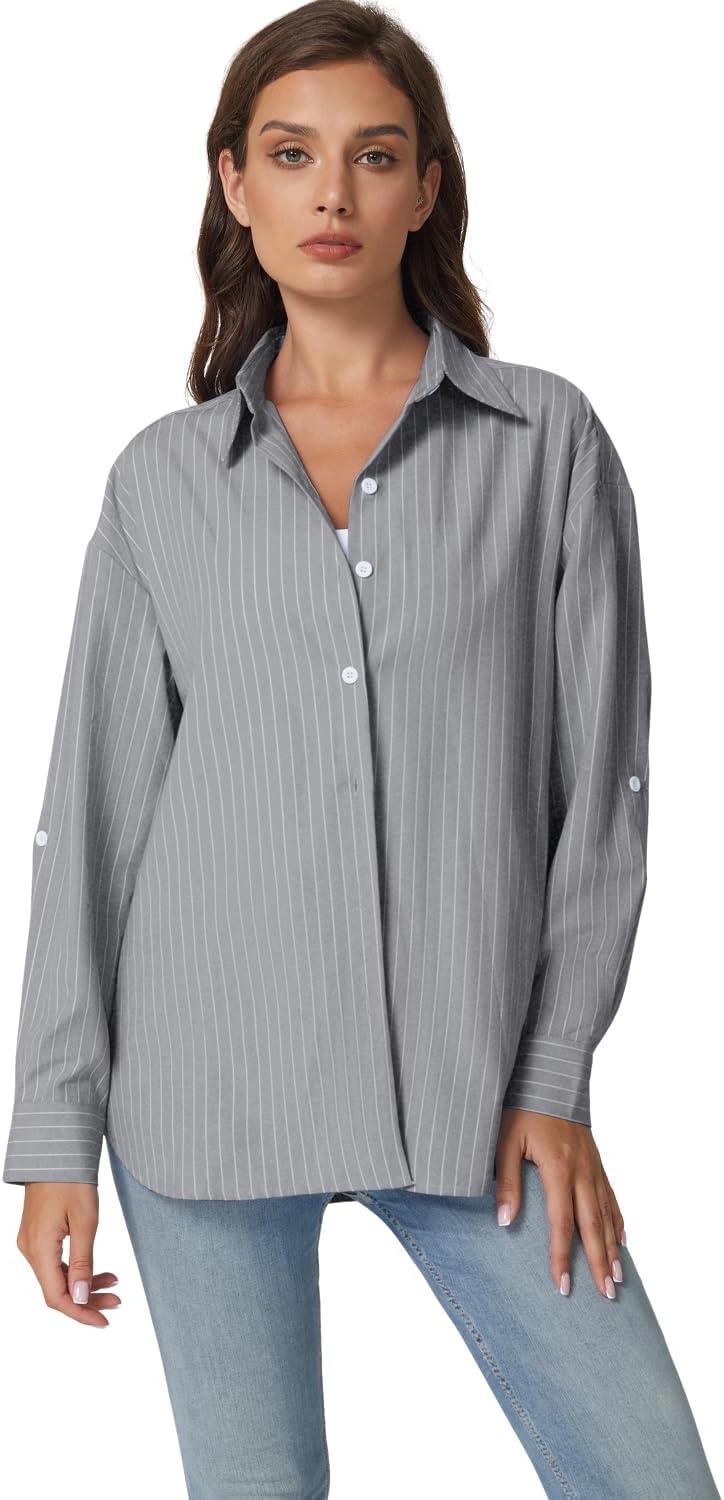 QINSEN Oversized Button Down Shirts for Women Long Sleeve Striped Casual Blouse Cotton Tops(Dove)