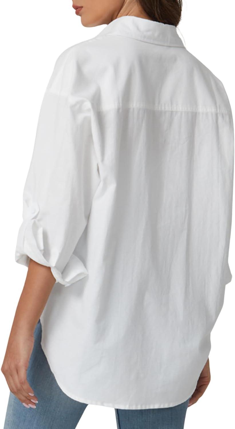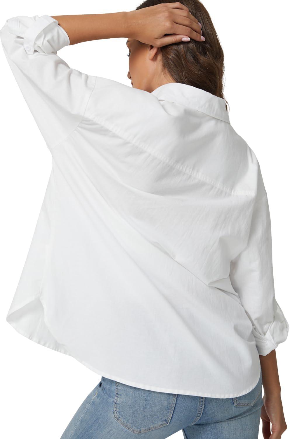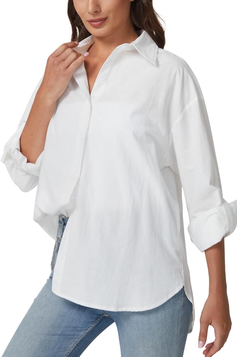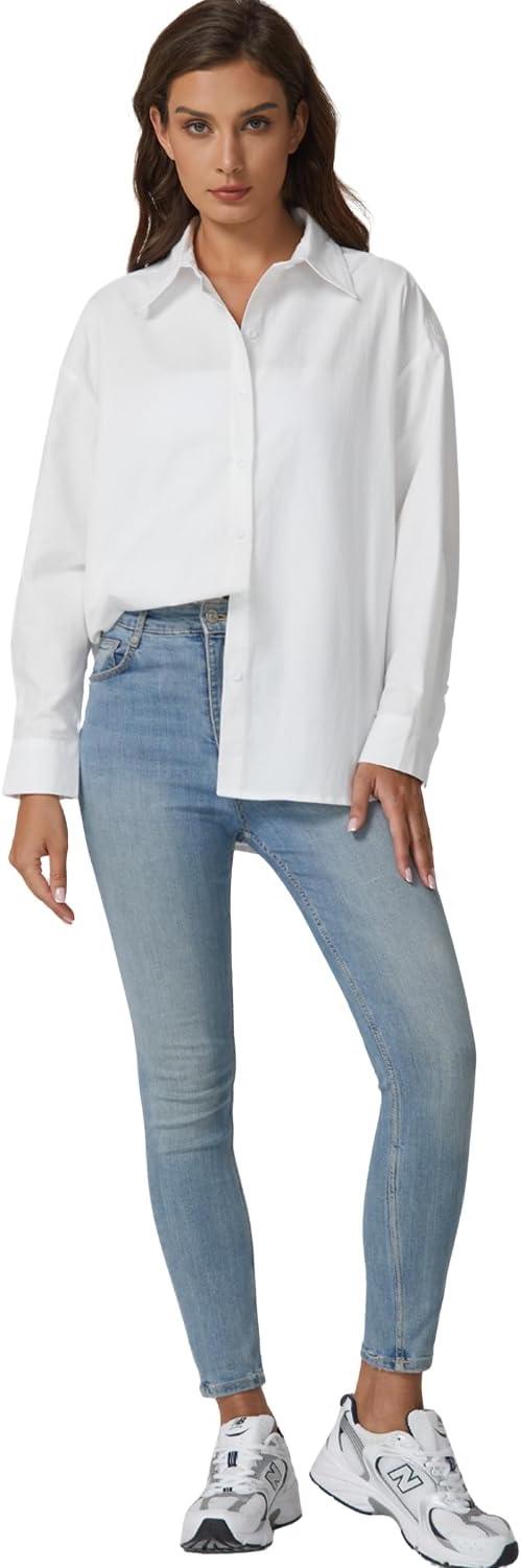 QINSEN Oversized Button Down Shirts for Women Long Sleeve Striped Casual Blouse Cotton Tops(White)