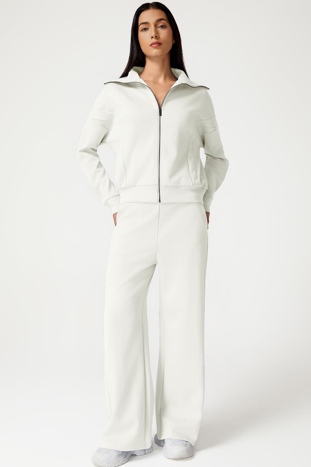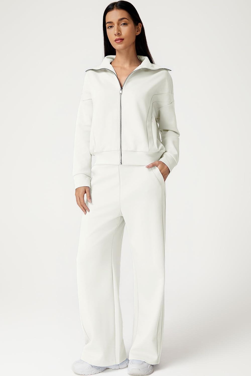 QINSEN Women’s Cotton 2 Piece Outfits Lapel Long Sleeve Zip Up Sweatshirt Wide Leg Pants Matching Tracksuit Sets(Beige)