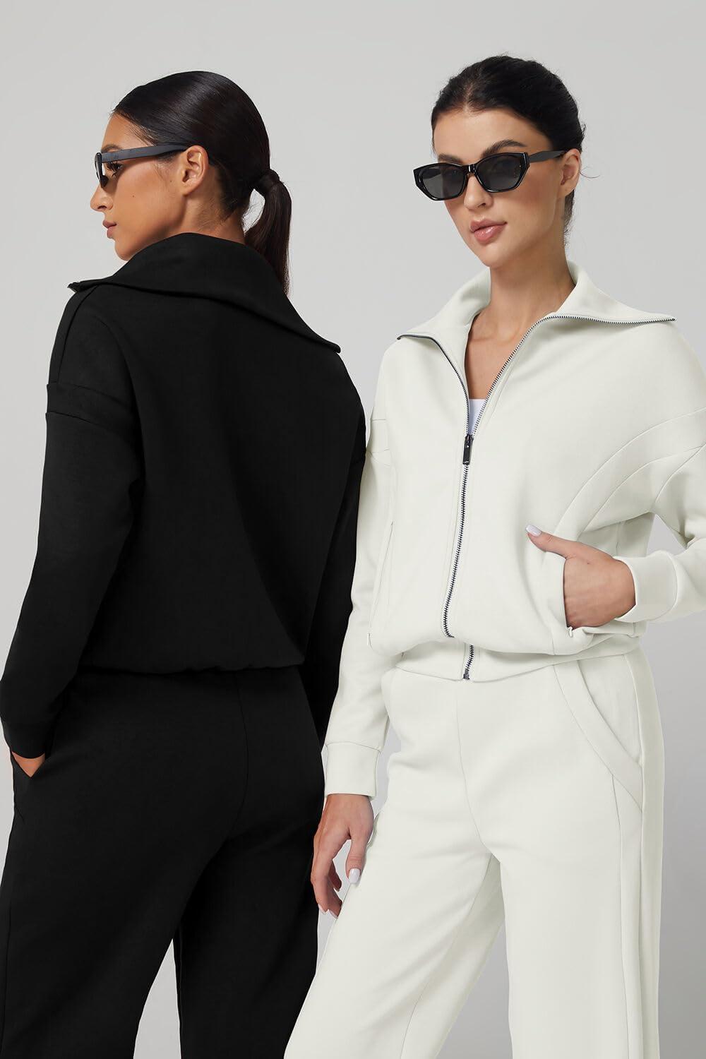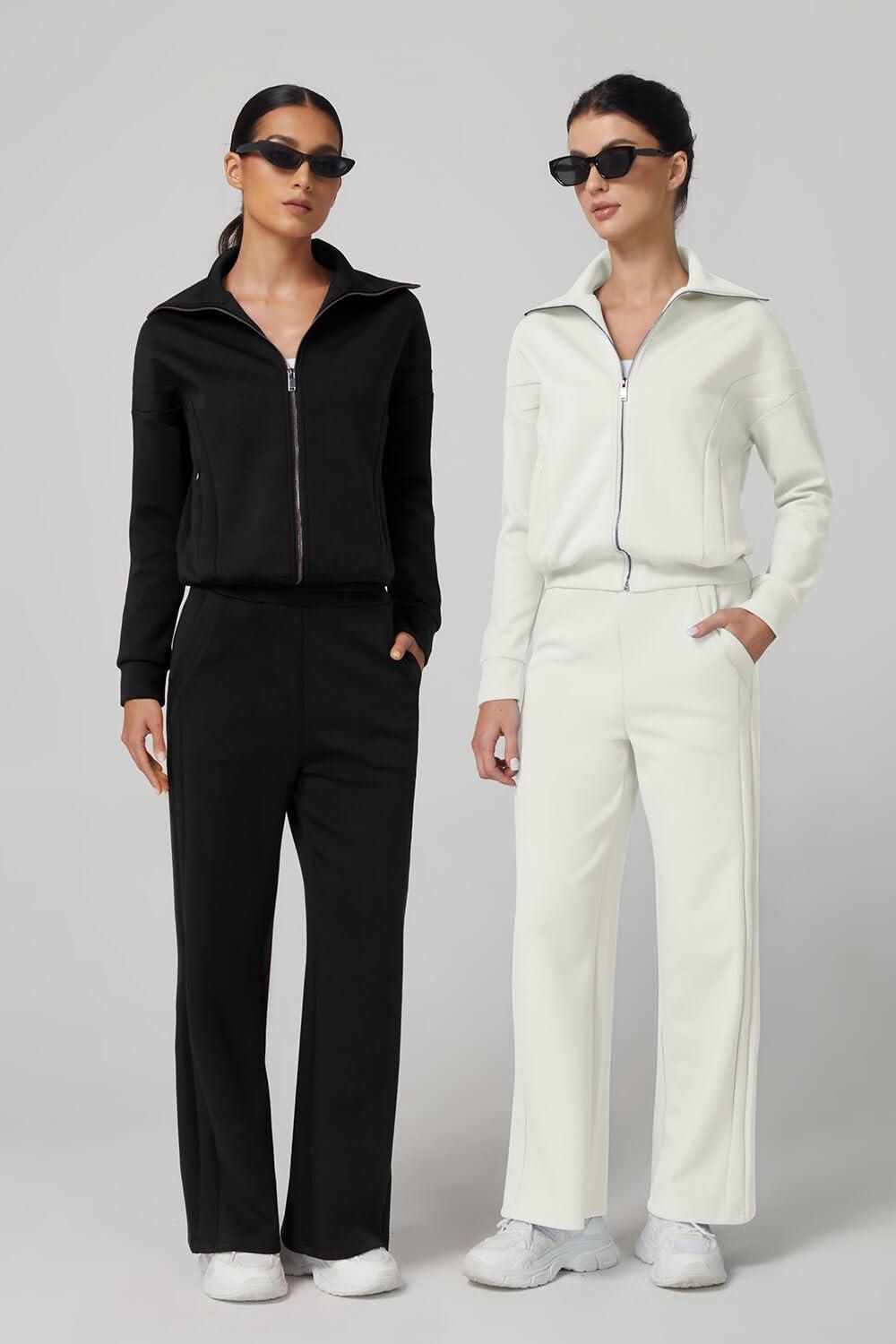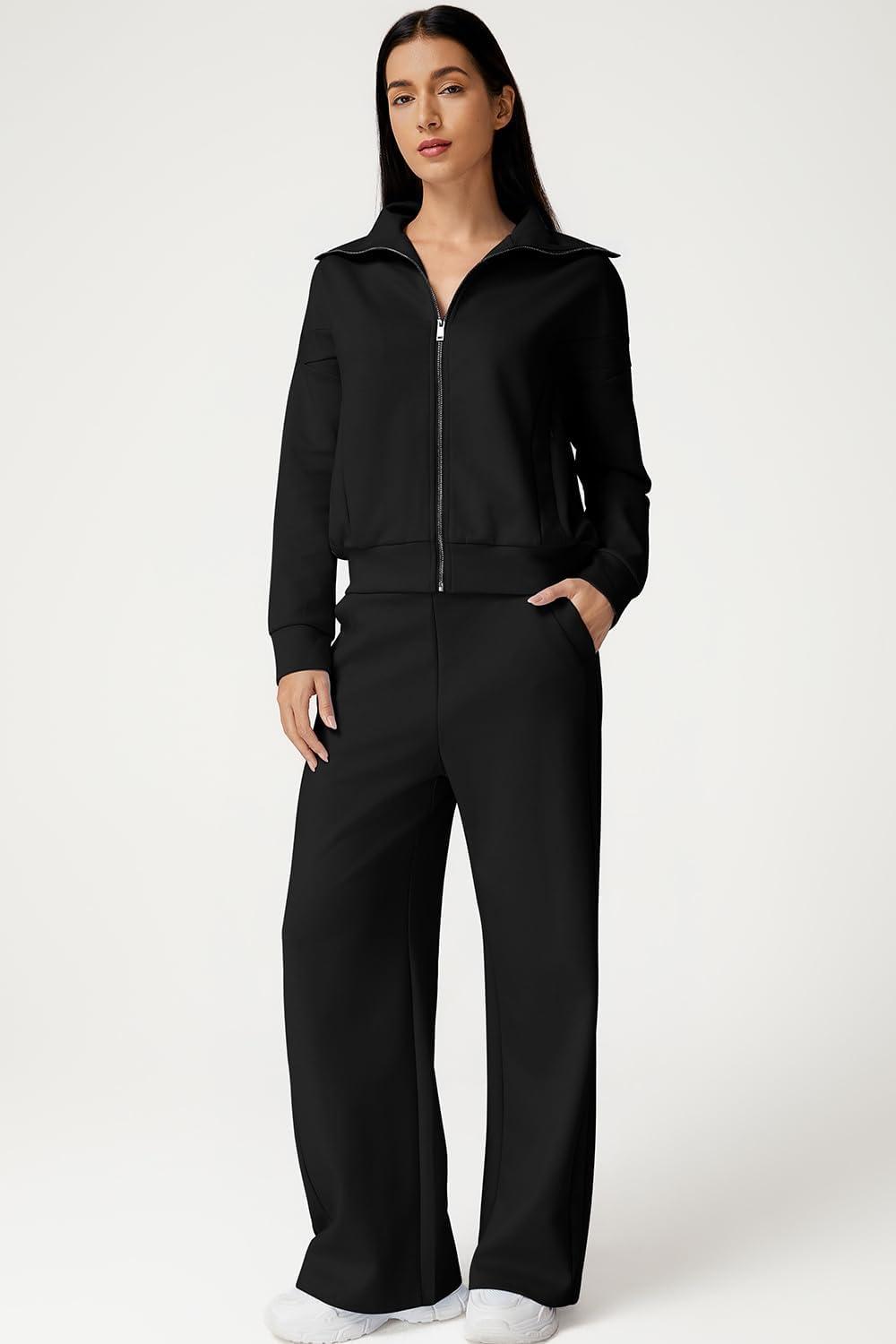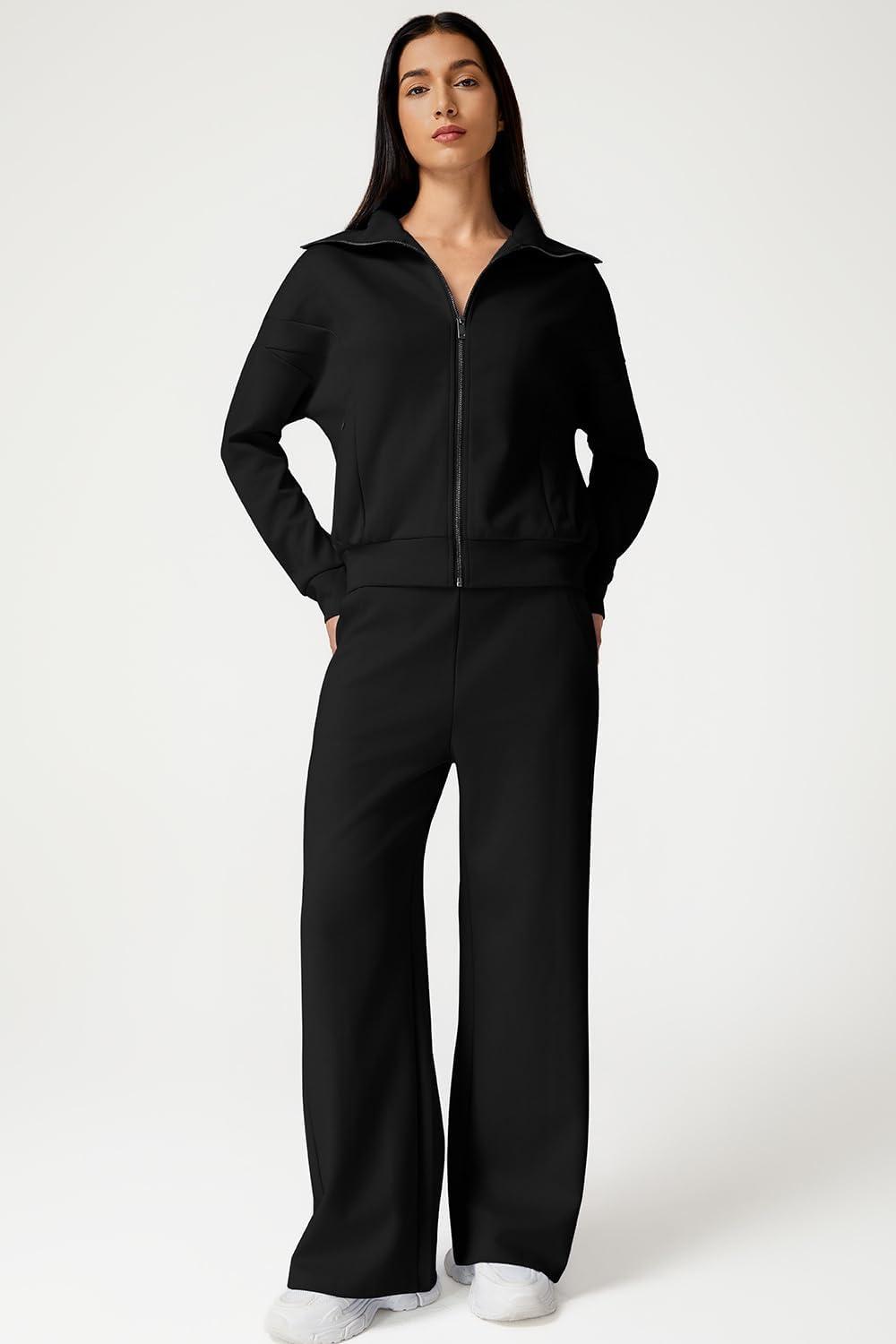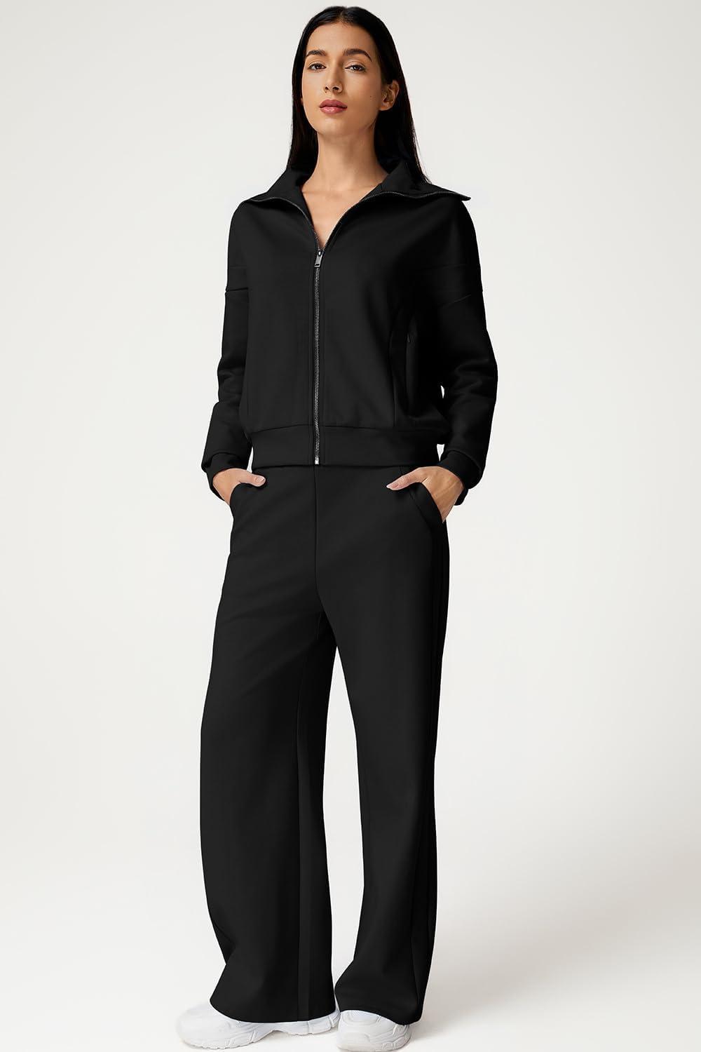 QINSEN Women’s Cotton 2 Piece Outfits Lapel Long Sleeve Zip Up Sweatshirt Wide Leg Pants Matching Tracksuit Sets(Black)