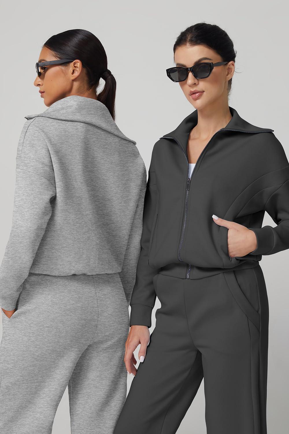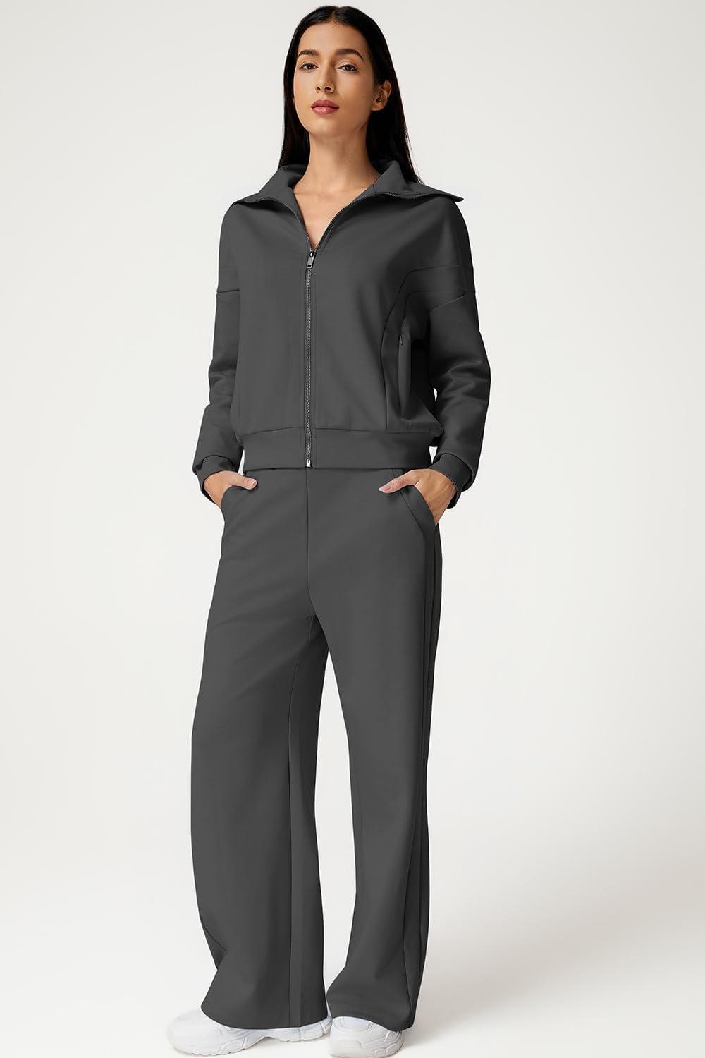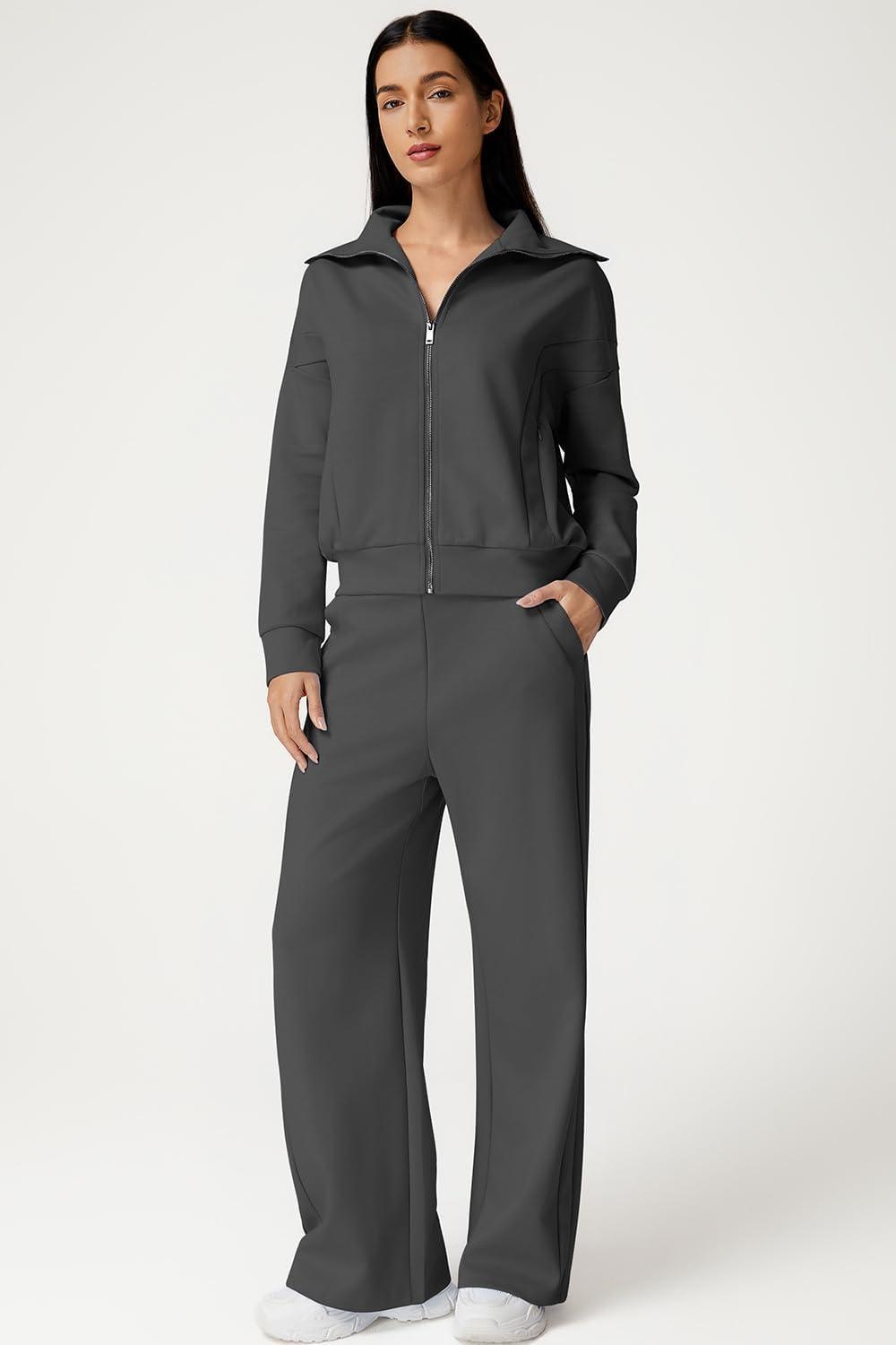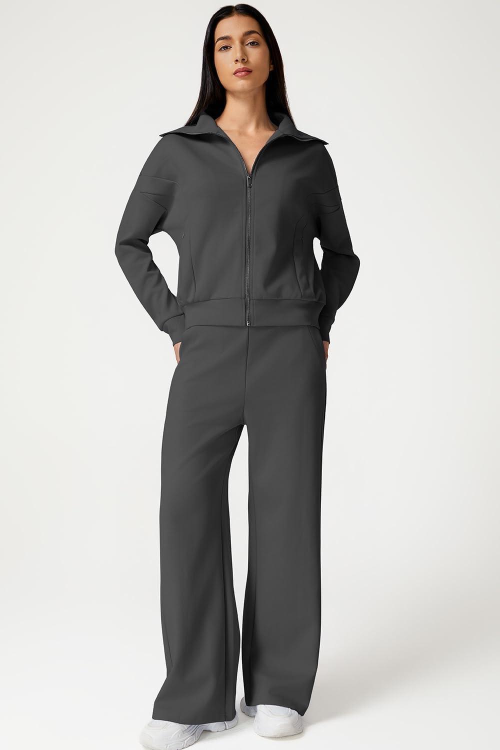 QINSEN Women’s Cotton 2 Piece Outfits Lapel Long Sleeve Zip Up Sweatshirt Wide Leg Pants Matching Tracksuit Sets(Dark Grey)