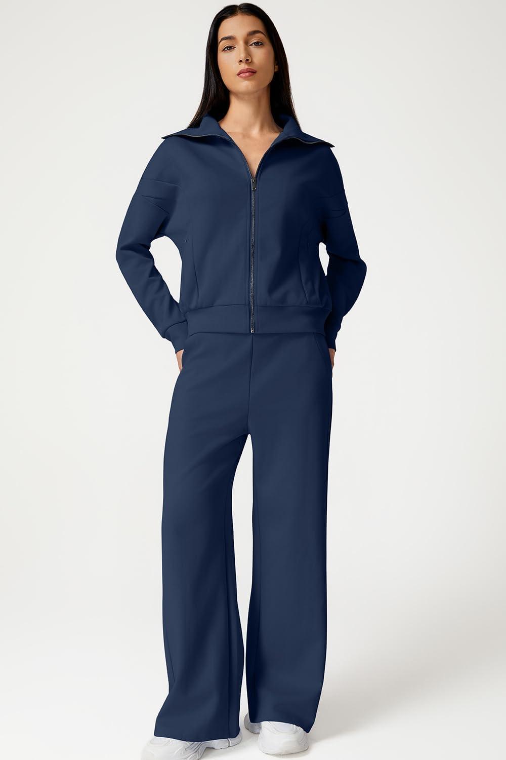 QINSEN Women’s Cotton 2 Piece Outfits Lapel Long Sleeve Zip Up Sweatshirt Wide Leg Pants Matching Tracksuit Sets(Navy Blue)