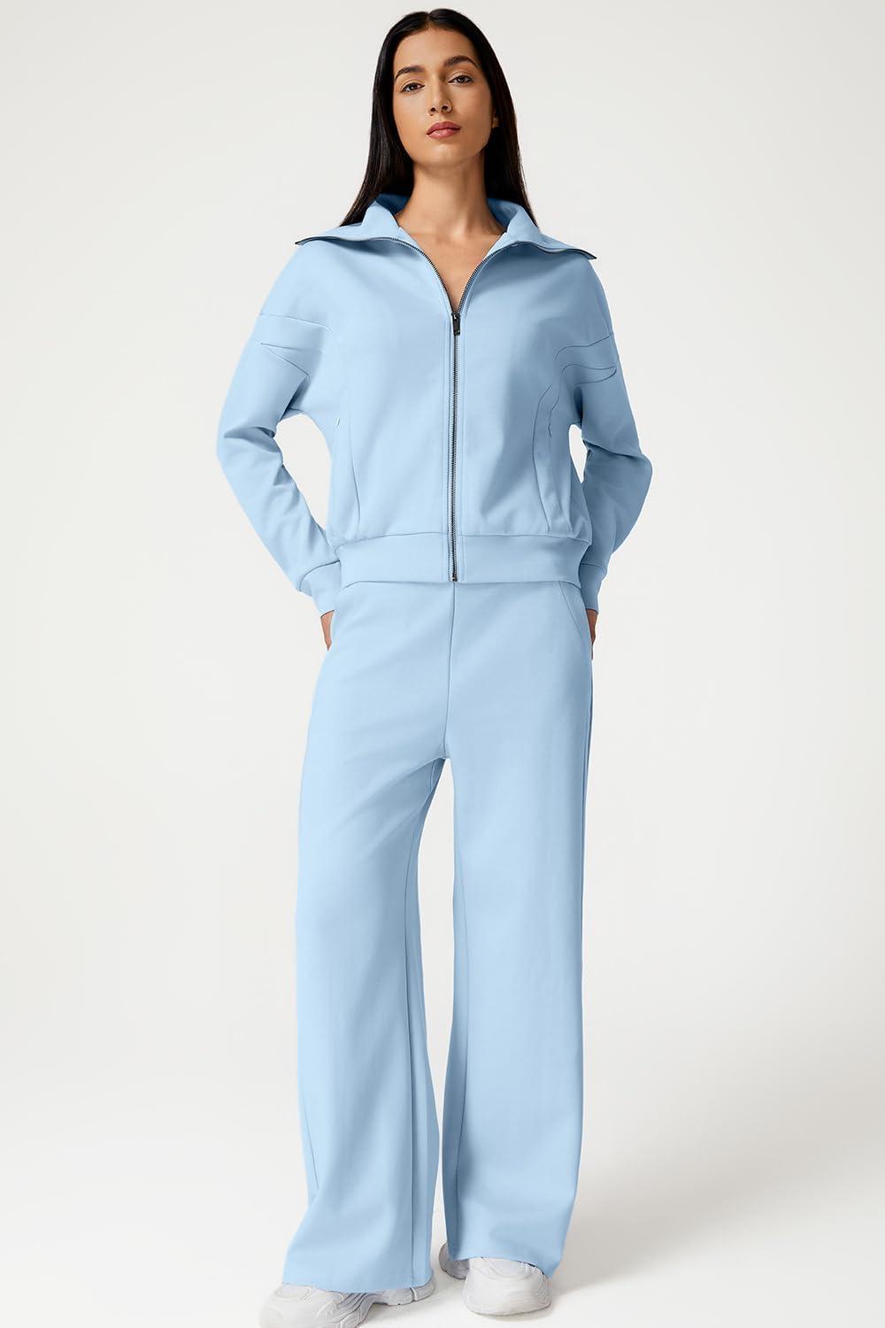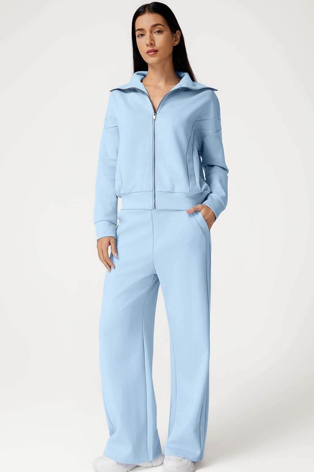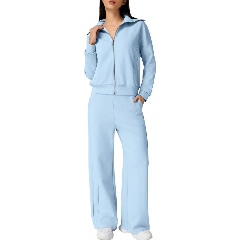 QINSEN Women’s Cotton 2 Piece Outfits Lapel Long Sleeve Zip Up Sweatshirt Wide Leg Pants Matching Tracksuit Sets(Sky Blue)