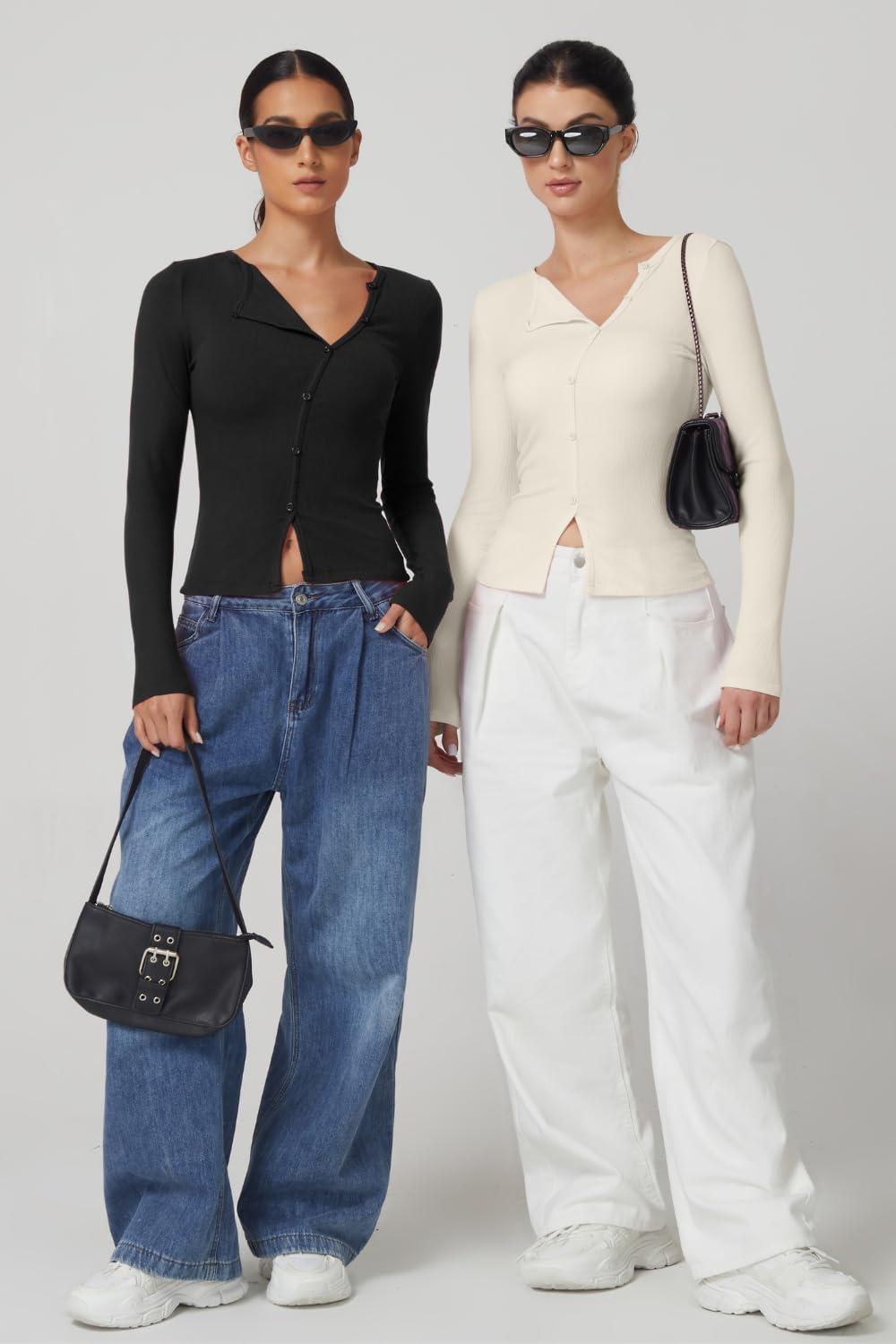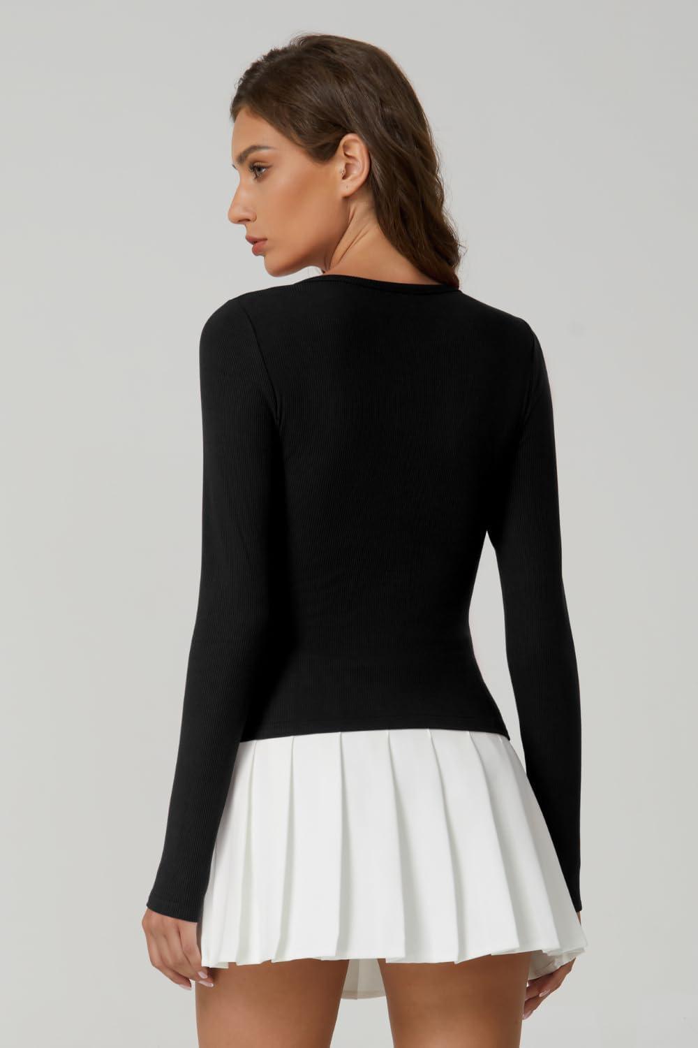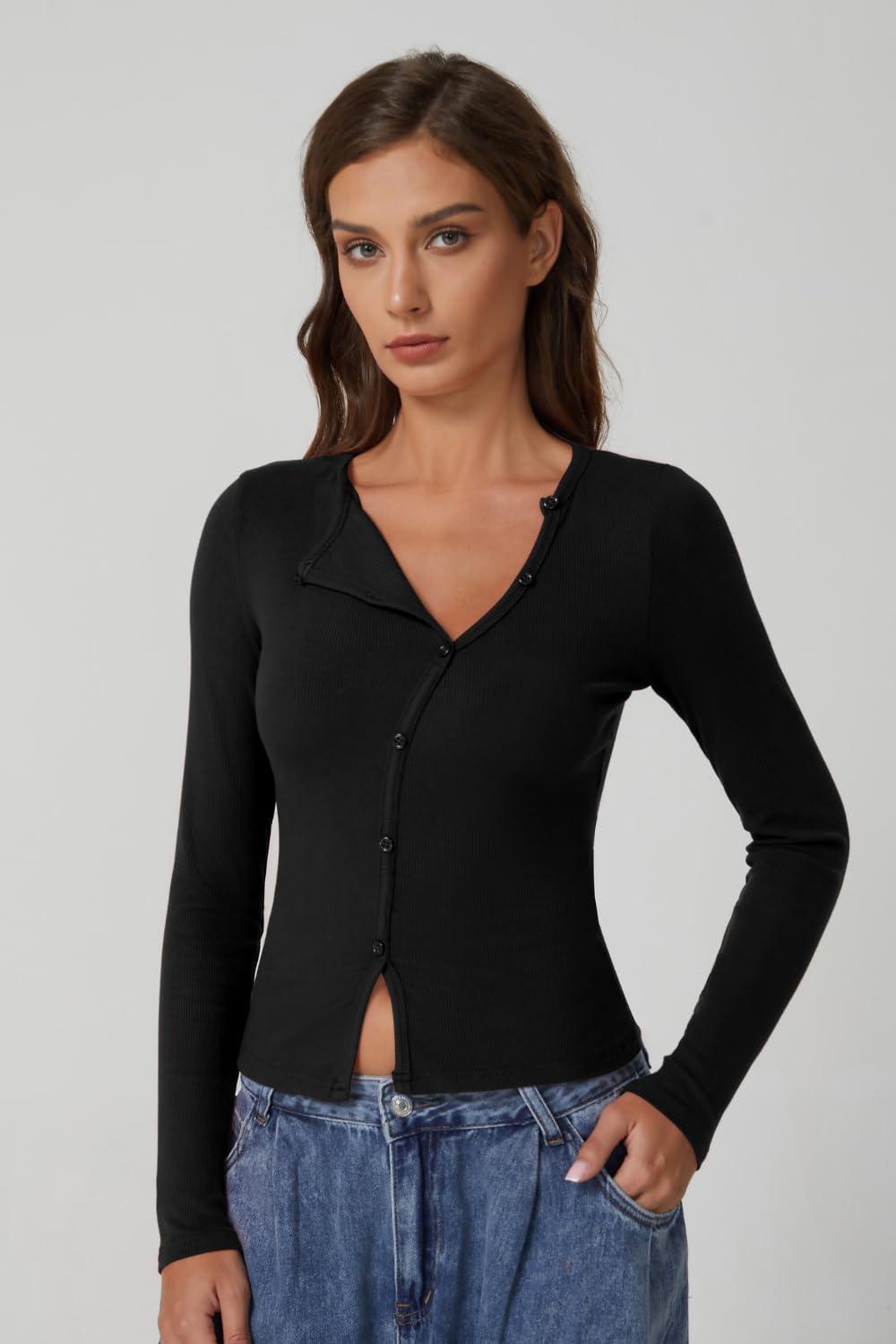 QINSEN Women’s Long Sleeve Ribbed Crewneck Shirts Upper Button Fastening Going Out Tops(Black)