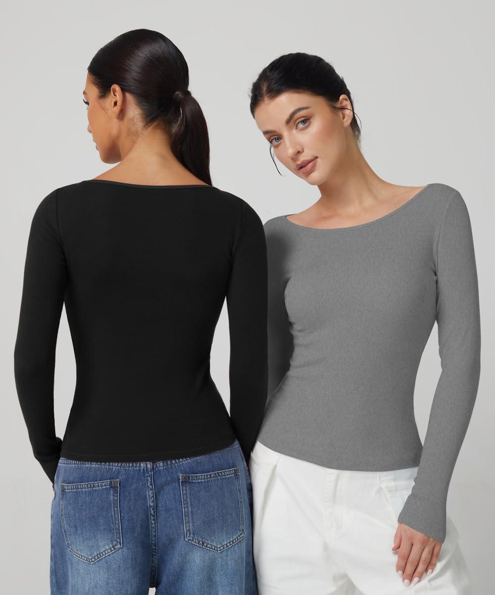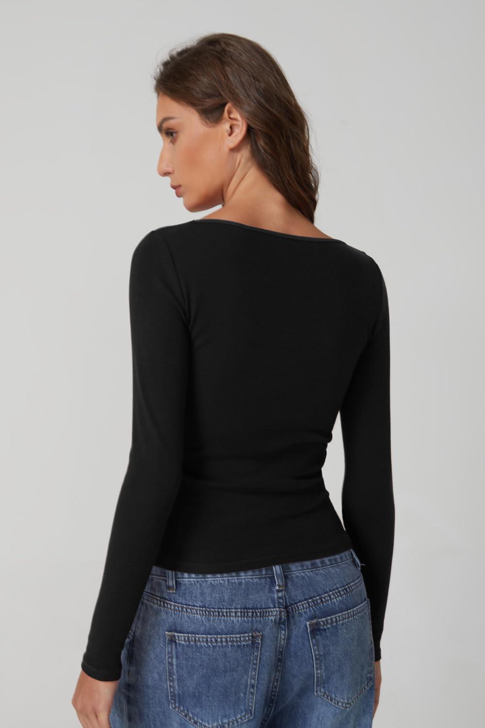 QINSEN Women’s Long Sleeve T Shirts Crewneck Tight Fitted Rib Knit Y2k Casual Tee Tops(Black)