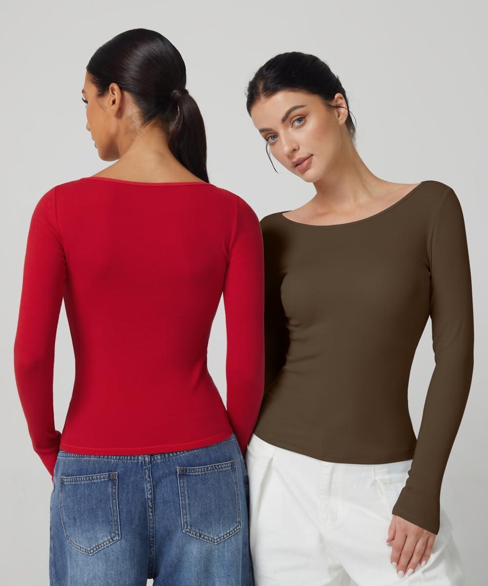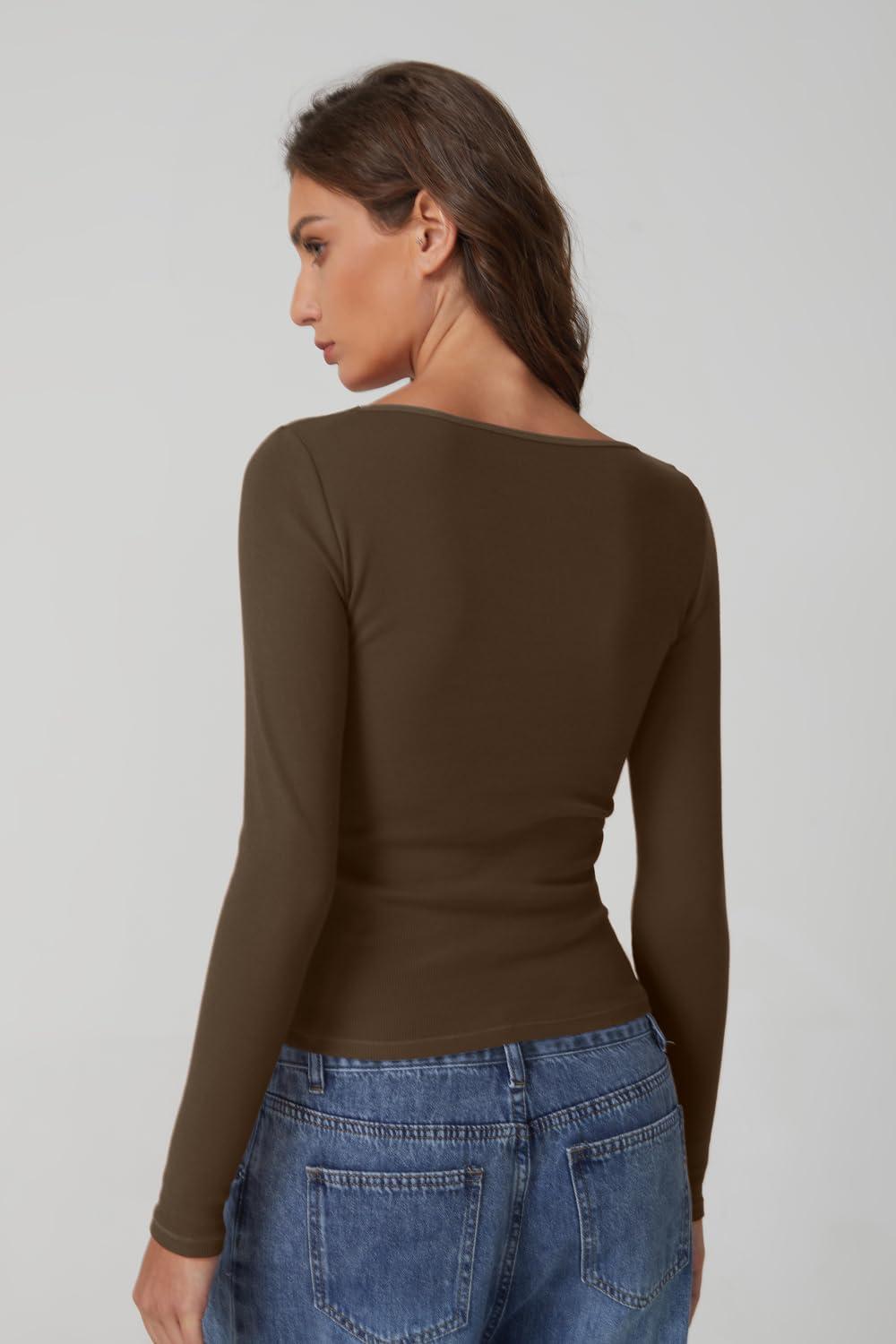 QINSEN Women’s Long Sleeve T Shirts Crewneck Tight Fitted Rib Knit Y2k Casual Tee Tops(Brown)