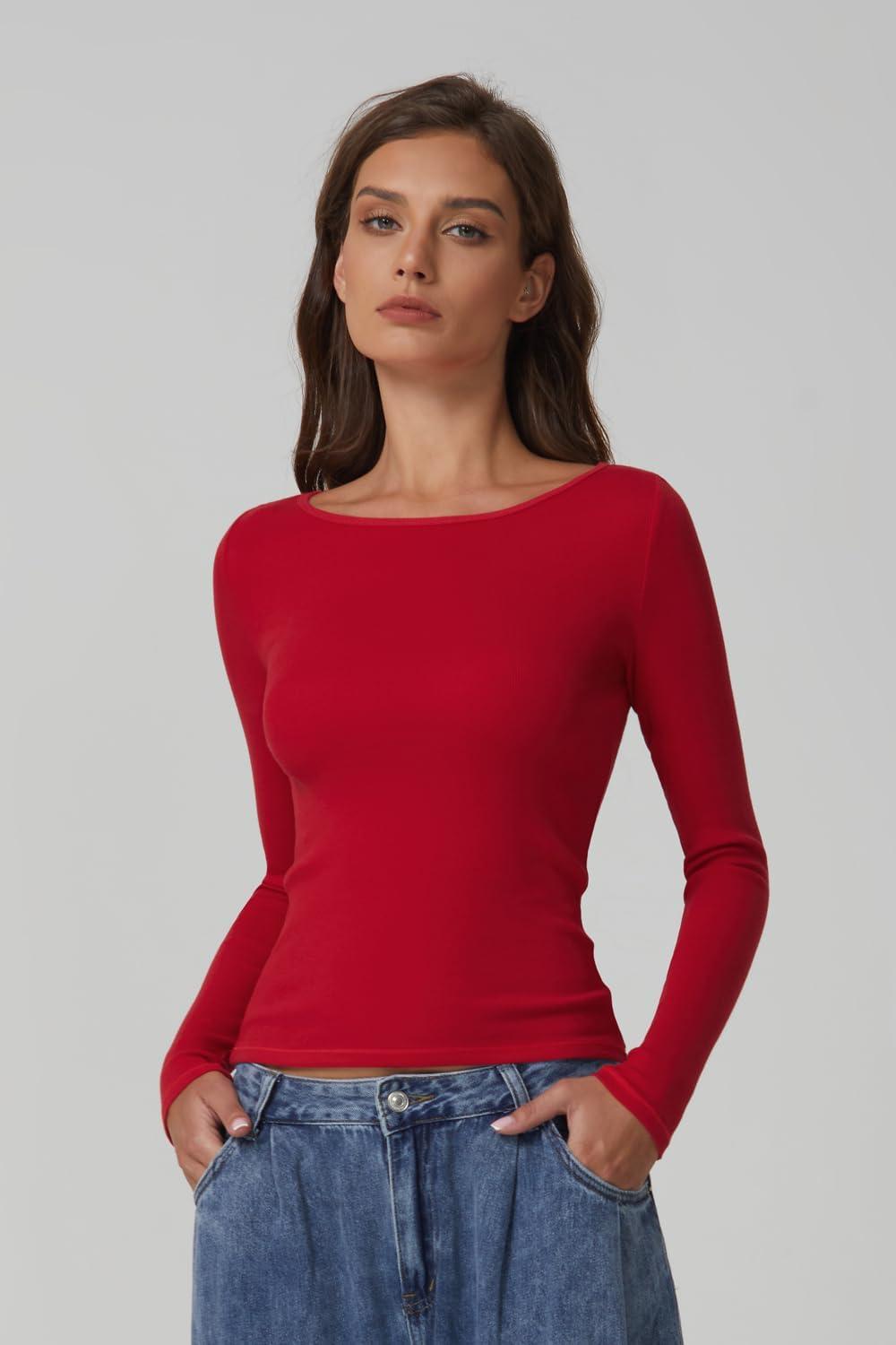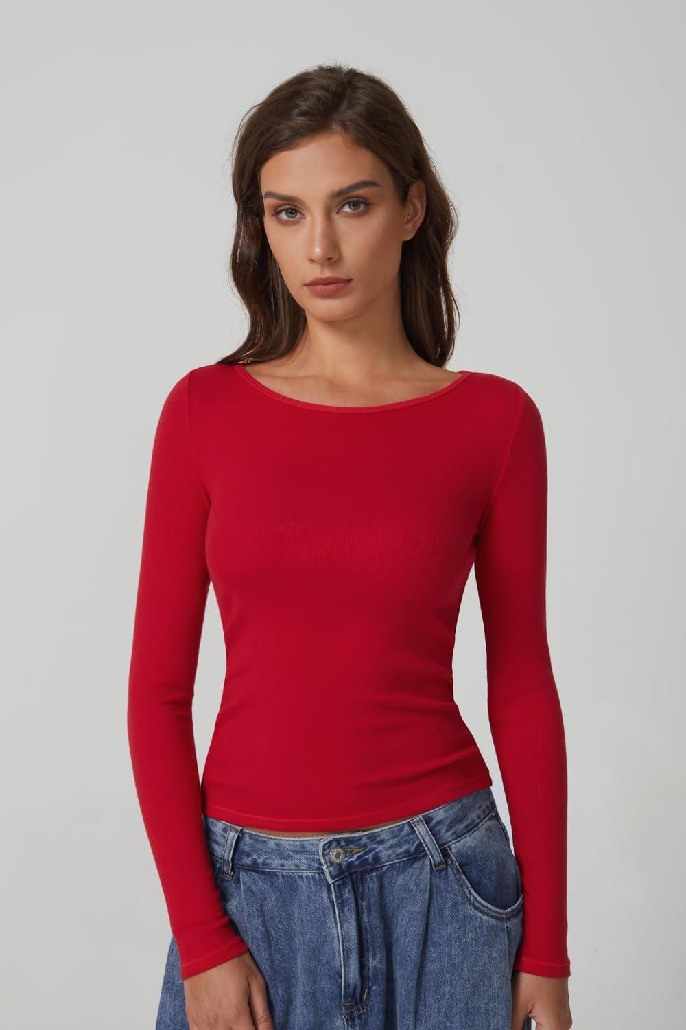 QINSEN Women’s Long Sleeve T Shirts Crewneck Tight Fitted Rib Knit Y2k Casual Tee Tops(Red)