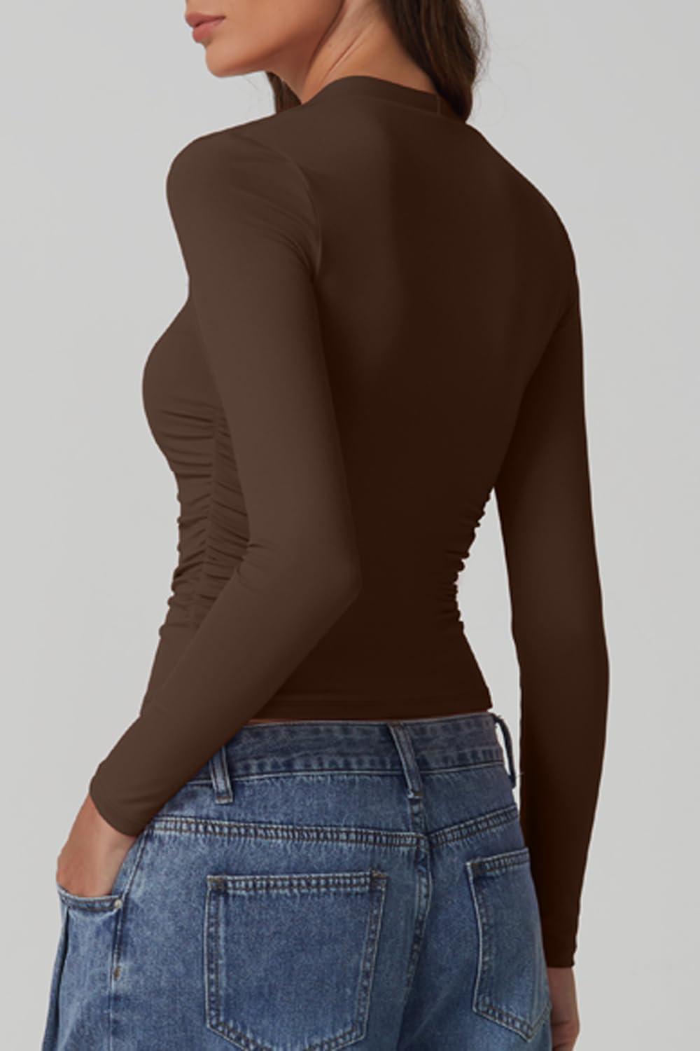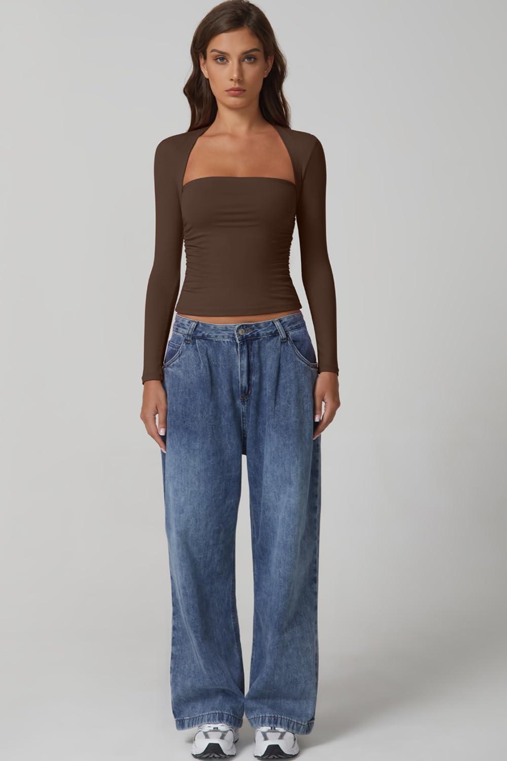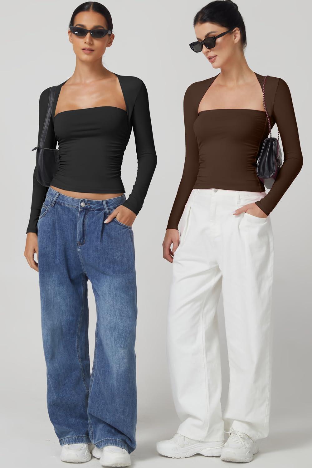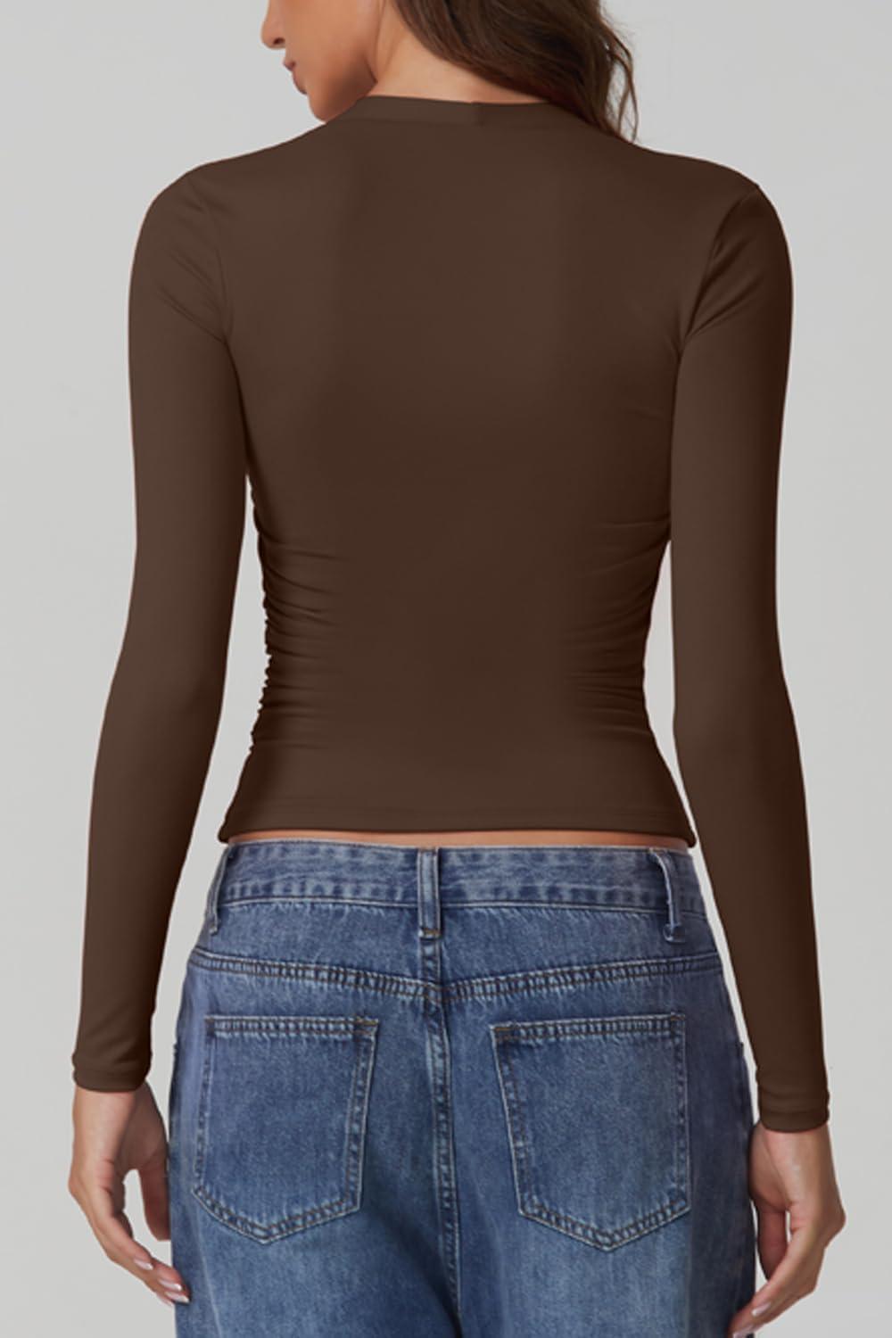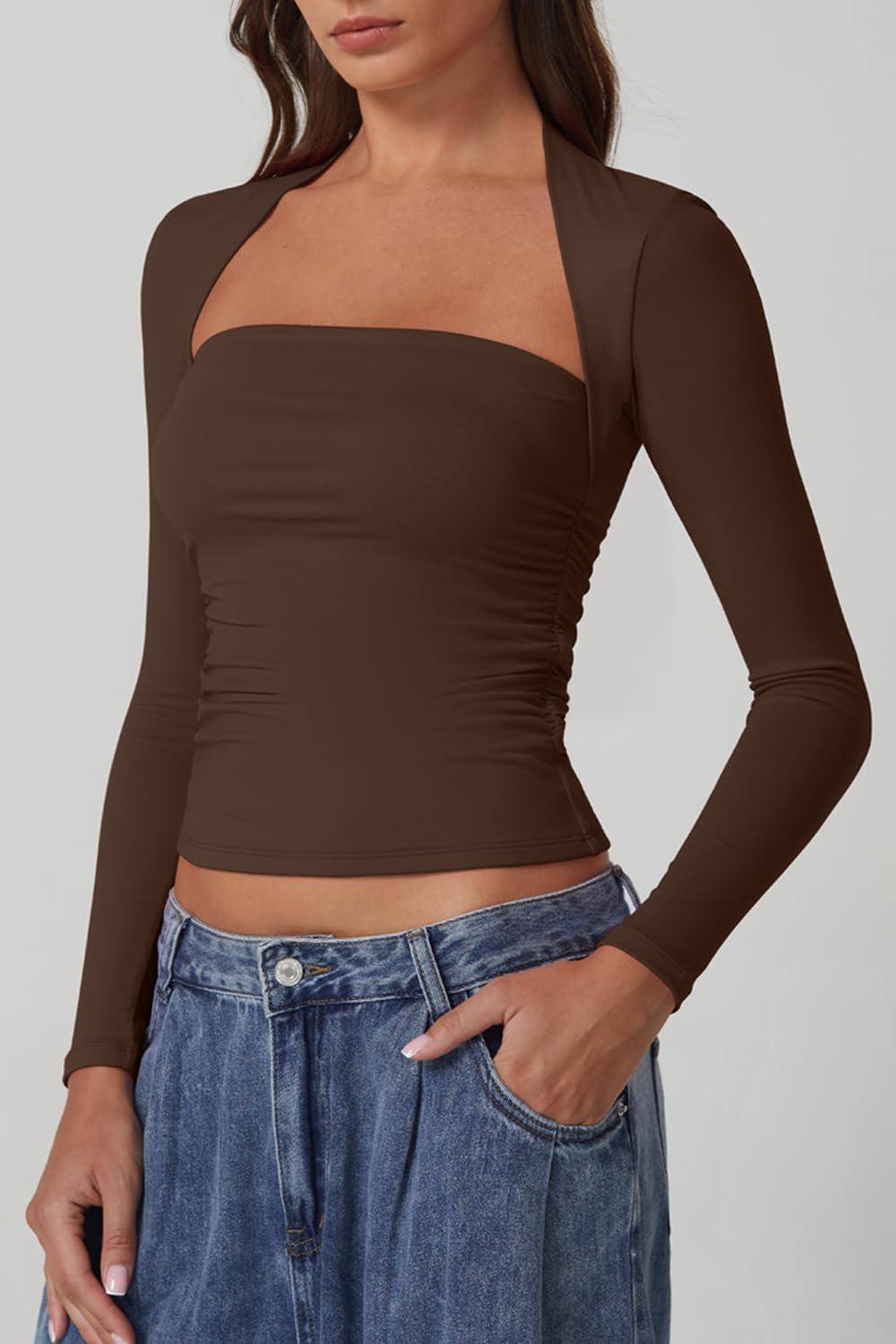 QINSEN Womens Square Neck Long Sleeve Basic Tops Double Lined Slimming Fit Going Out Tee Shirt Crop Top.