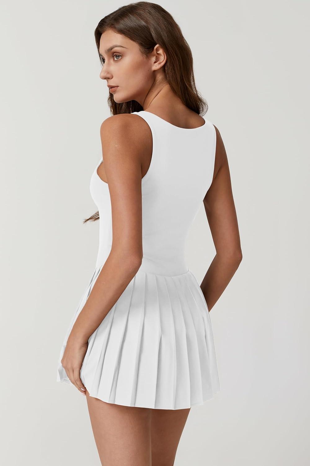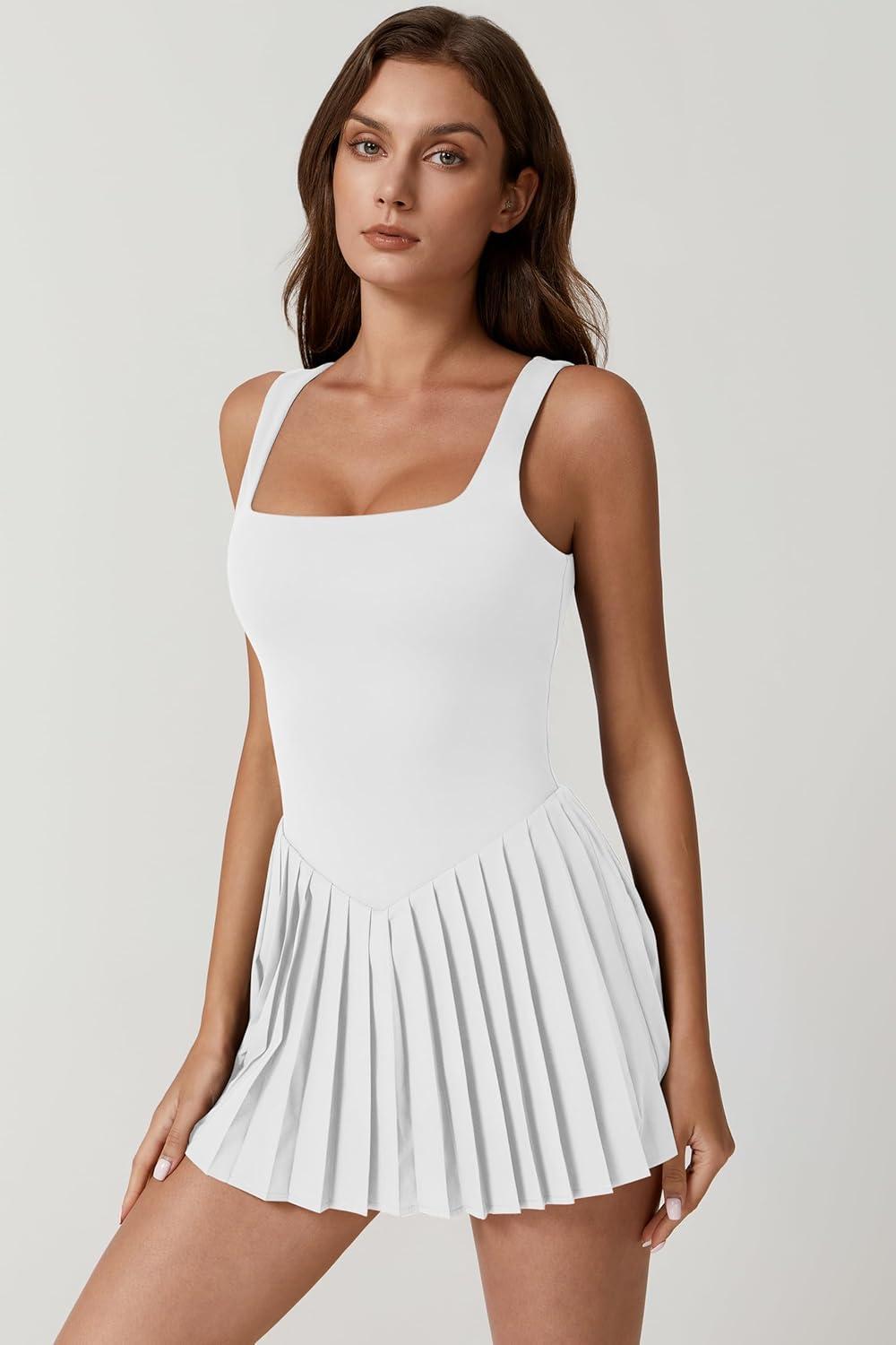 QINSEN Womens Square Neck Tennis Dress Pleated Sleeveless Built in Shorts Golf Athletic Dress with Pockets(White)