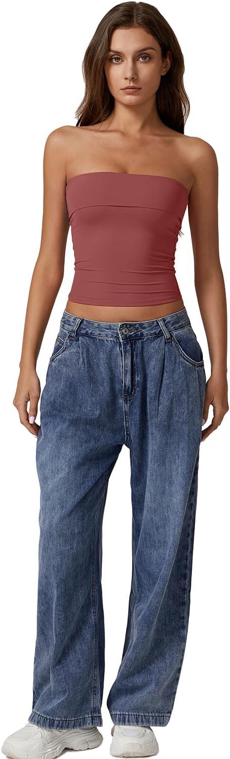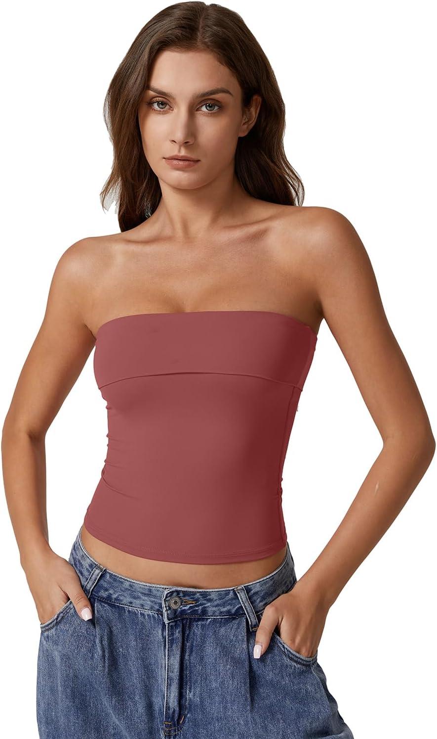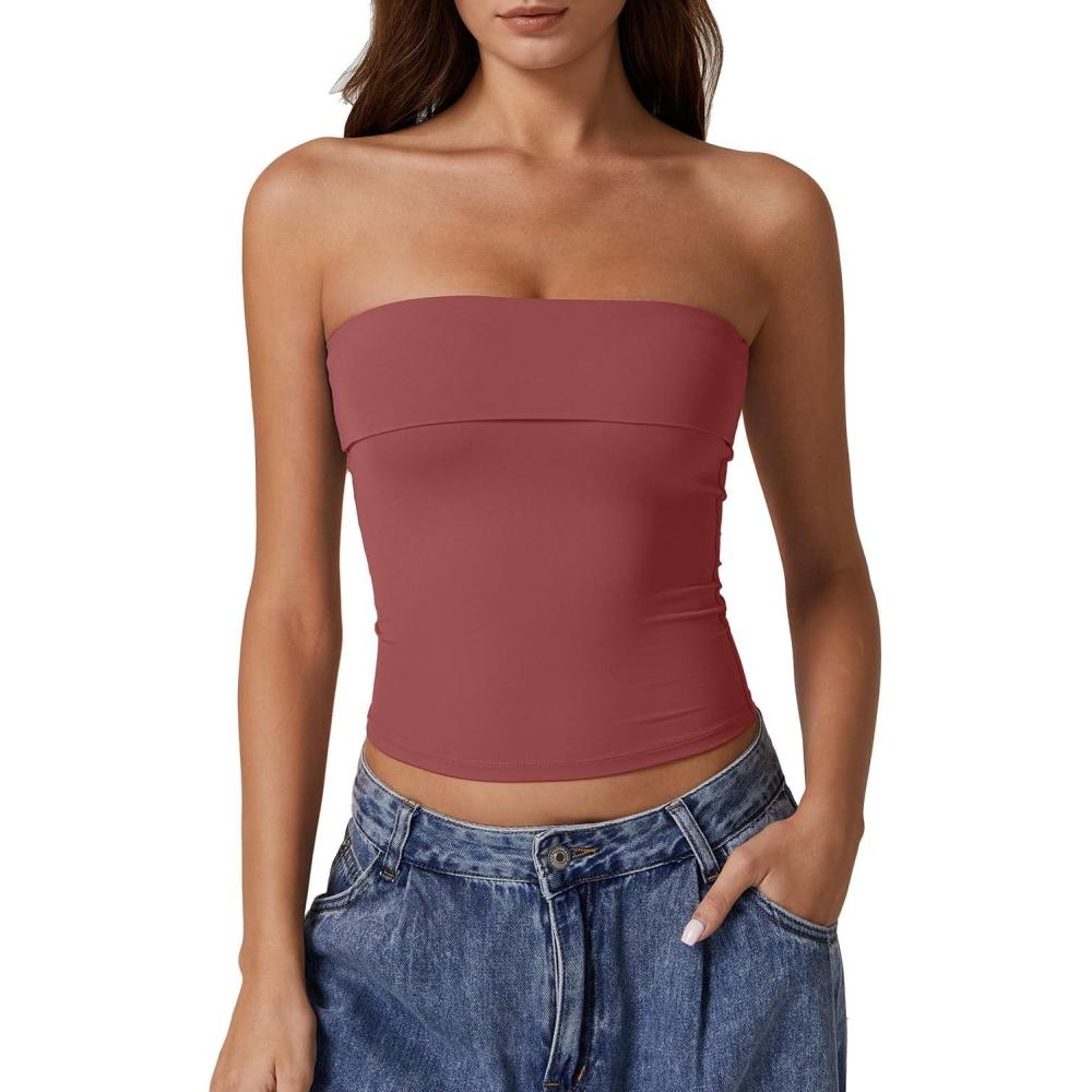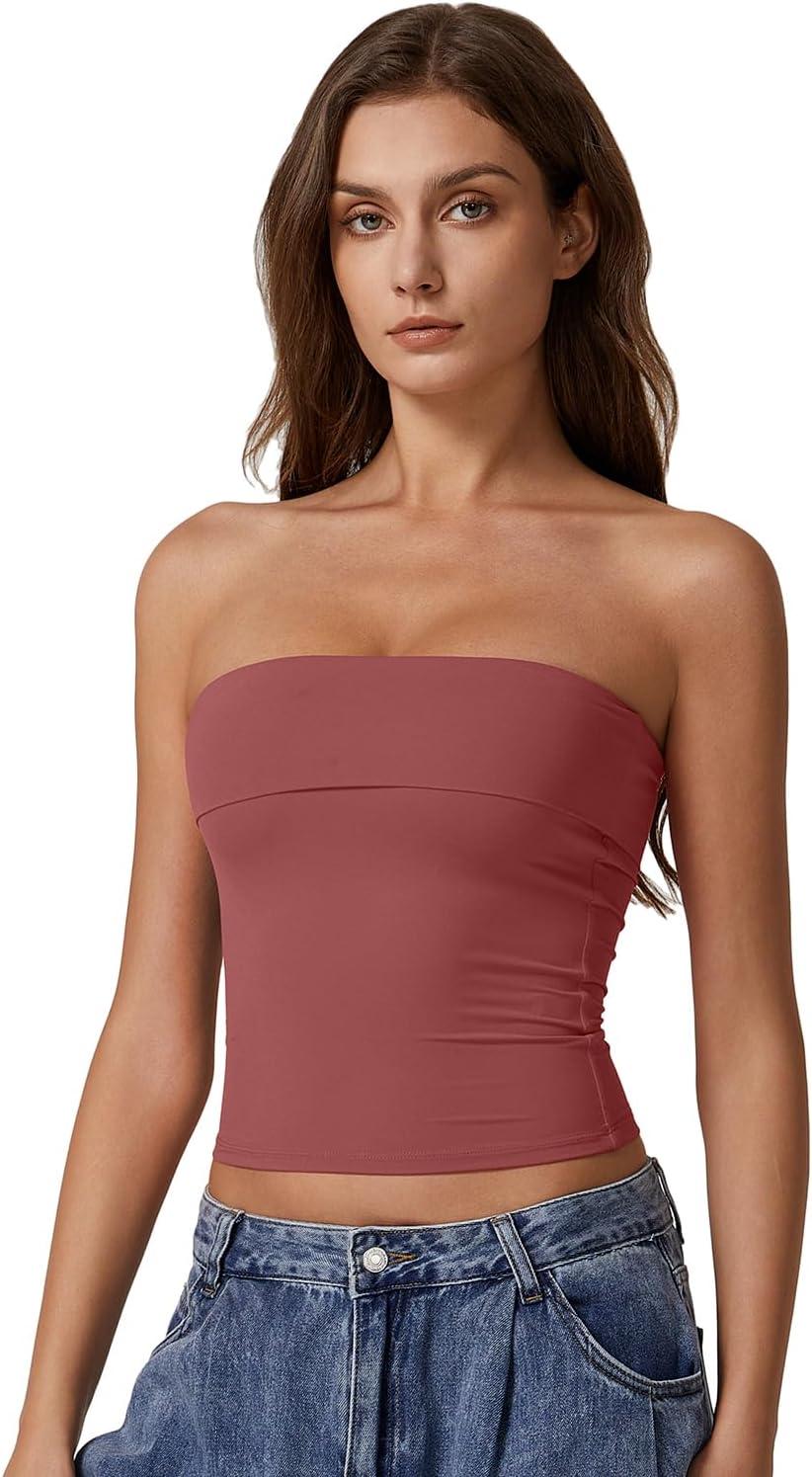 QINSEN Women’s Tube Tops Strapless Bandeau Tops Double Lined Slim Fit Summer Going Out Tank Tops(Merlot)